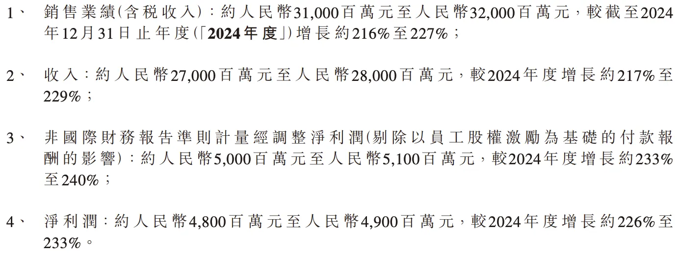 从含税销售业绩口径来看,2025年度预计约为人民币310亿元至320亿元,较2024年增长约216%至227%。